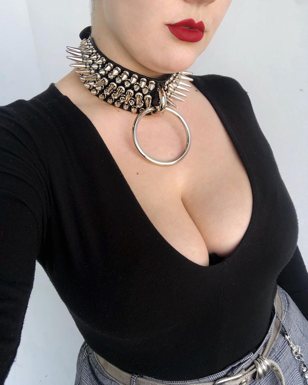 The Cleopatra style is a 2" wide choker adorned with over 100 hand set spikes of various sizes finished with an extra large 2.5" wide O-Ring. Each choker fastens at the back of the neck and is adjustable so that you can find your perfect fit.